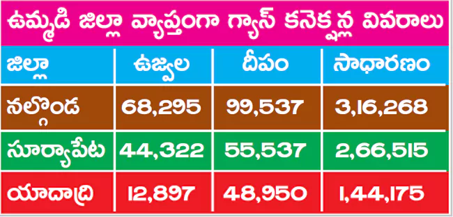 - ఉమ్మడి జిల్లాలో గ్యాస్ సిలిండర్లను అందించేందుకు పలు ఏజెన్సీలున్నాయి. వీటి పరిధిలో దీపం, ఉజ్వల, ప్రైవేటు గ్యాస్ కనెక్షన్లు కలిపి 12.10 లక్షలకు పైగా ఉన్నాయి. ప్రతి కుటుంబానికి నెల నుంచి రెండు నెలల వ్యవధిలో 14.2 కేజీల బండను రూ.925 అందిస్తున్నారు. వాణిజ్య సిలిండర్ ధర రూ.19 కేజీలది రూ.1820 పైగా ఉంటుంది. దీంతో తక్కువ ధర ఉన్న గృహావసరాల సిలిండర్లనే వాణిజ్యానికి వినియోగిస్తున్నారు.