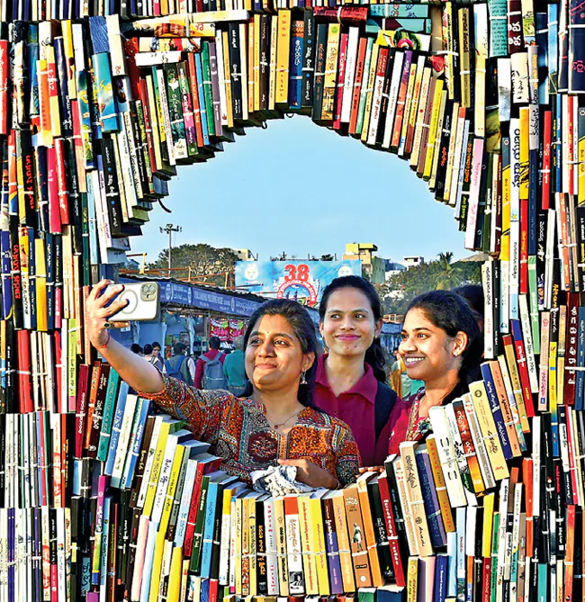 ఎన్టీఆర్ స్టేడియంలోని బుక్ ఫెయిర్లో సెల్ఫీ బూత్ ఏర్పాటు చేశారు. ‘పుస్తకాల గోడ’లా దాన్ని తీర్చిదిద్దారు. మధ్యలో నుంచి ఫొటోలు దిగుతున్నారు.