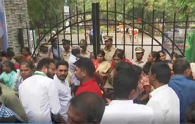 విశాఖపట్నం: విశాఖలో వైకాపా నేతలు అత్యుత్సాహం ప్రదర్శించారు. అధికారులకు తప్పుడు సమాచారం ఇచ్చి.. వీఎంఆర్డీఏలో పార్టీ చేరికల కార్యక్రమాన్ని నిర్వహించేందుకు యత్నించారు. మహా నగరాభివృద్ధి సంస్థ అధికారులు అభ్యంతరం చెప్పడంతో మాజీ మంత్రి గుడివాడ అమర్నాథ్ ఆధ్వర్యంలో వీఎంఆర్డీఏ ఎరీనా గేట్ వద్ద తూతూ మంత్రంగా పార్టీ చేరికల కార్యక్రమం నిర్వహించారు. పార్టీ చేరికల కార్యక్రమం అంటే అధికారులు అనుమతి ఇవ్వరని ముందే గ్రహించిన వైకాపా నేతలు.. మిత్రుల సమ్మేళనమని మభ్యపెట్టి వీఎంఆర్డీఏ ఎరీనాలో అనుమతి తీసుకునేందుకు యత్నించారు. అసలు విషయం తెలుసుకున్న అధికారులు అభ్యంతరం తెలిపారు. పోలీసులు అక్కడికి చేరుకోవడంతో చేసేదేం లేక.. గేటు వద్దే తూతూమంత్రంగా కార్యక్రమం నిర్వహించారు.