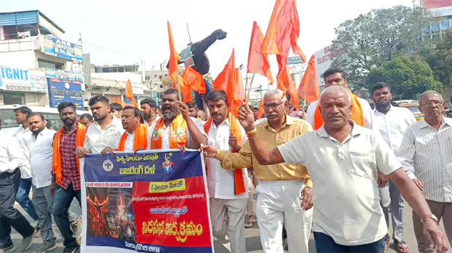 Capra: Bajrang Dal Telangana State Vice President Srikanth has called upon the people of the country to oppose the violence against Hindus in Bangladesh with open arms. On Tuesday, Vishwa Hindu Parishad and Bajrang Dal Malkajigiri branches organized protest programs in Capra. From Kushaiguda Bus Stand to ECIL Square, a protest was held with placards and banners. They demanded to stop attacks on Hindus. Loud slogans were raised against Bangladesh. Leaders Karthik, Venkatachalam, Challa Prabhakar, Ganesh, Rajinikanth Reddy, Arun, CH Srikanth, Akhil, Sumanth, Vishal participated in this program.