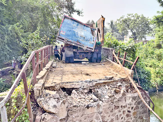 In Pamulapadu village, a sand tipper with a heavy load overturned the Dospadu canal bridge. Collapsed.