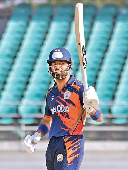 హార్దిక్ పాండ్య (133; 92 బంతుల్లో 8×4, 11×6) మెరుపు శతకం సాధించినా.. రాజ్కోట్లో విదర్భతో గ్రూప్-బి మ్యాచ్లో బరోడా 9 వికెట్ల తేడాతో ఓడింది. మొదట బరోడా 9 వికెట్లకు 293 పరుగులు చేసింది. ఒక దశలో ఆ జట్టు 71/5తో కష్టాల్లో పడింది. ఈ స్థితిలో ఏడో స్థానంలో బ్యాటింగ్కు దిగిన హార్దిక్.. విధ్వంసక ఇన్నింగ్స్ ఆడాడు. ఒకవైపు వికెట్లు పడుతున్నా.. ఎడాపెడా బౌండరీలు బాదాడు. స్పిన్నర్ పార్థ్ రేఖడే వేసిన 39వ ఓవర్లో అతడు విశ్వరూపం చూపించాడు. వరుసగా 6, 6, 6, 6, 6, 4తో 34 పరుగులు రాబట్టాడు. ఈ క్రమంలోనే లిస్ట్-ఎలో తొలి శతకాన్ని అందుకున్నాడు. తొలి 66 పరుగులను 62 బంతుల్లో చేసిన హార్దిక్.. సెంచరీ చేయడానికి మరో 6 బంతులే తీసుకోవడం విశేషం. విదర్భ బౌలర్లలో యశ్ ఠాకూర్ (4/64) ఆకట్టుకున్నాడు. అమన్ (150 నాటౌట్; 121 బంతుల్లో 17×4, 4×6) భారీ సెంచరీ సాధించడంతో విదర్భ 41.4 ఓవర్లలో ఒక్క వికెటే కోల్పోయి లక్ష్యాన్ని అందుకుంది. ధ్రువ్ షోరే (65 నాటౌట్) రాణించాడు.