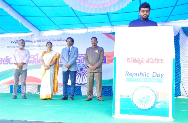 The 77th Republic Day celebrations were held on Monday at the corporate office of Andhra Pradesh Eastern Region Power Distribution Company (APEPDCL). On this occasion, the Chairman and Managing Director of the company Immadi Prithvithej unveiled the national flag. He then spoke. Certificates of appreciation were handed over to 80 employees who showed excellence in their duties on the occasion of Republic Day on Monday. Directors T.V. Suryaprakash, T. Vanaja, S. Haribabu, Chief Vigilance Officer K. V. Ramakrishnaprasad, CGMs D. Suman Kalyani, V. Vijayalalita, B. Ashok Kumar, L. Mahendranath, L. Daivaprasad, S. Vijayapratap, P. Venkateswara Rao, corporate office staff participated in this program.