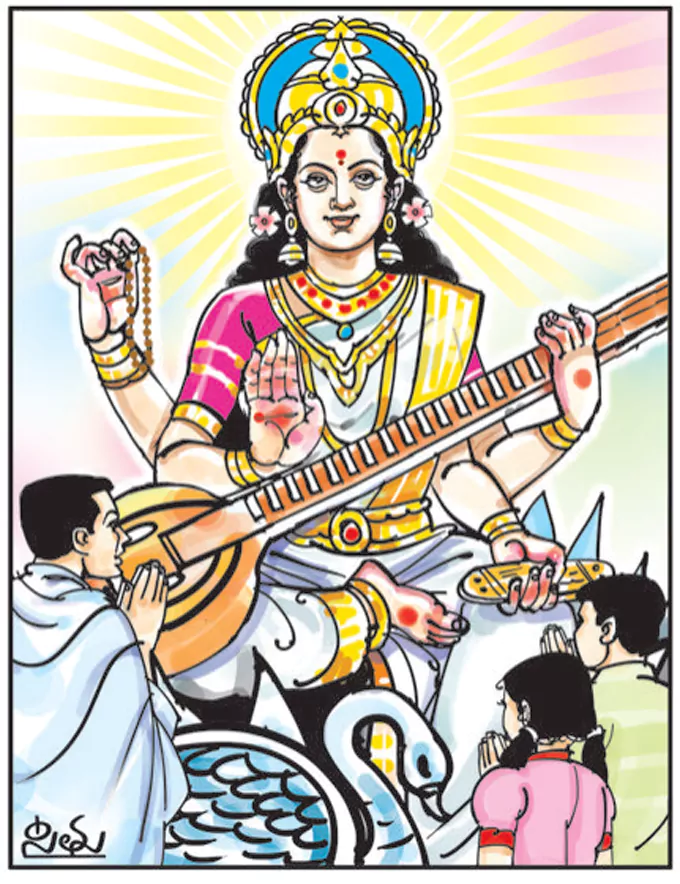 Education is the only eternal one among the Ashtaishwarya mentioned by our ancestors. The other seven - position, wealth, spouse, children, humility, courage, fortitude... none of them are stable or permanent. That is why Vedapanishats, Puraneetihasas, Dharmashastras and Kavyas have revealed the importance of education in context. 'Vidyaya Amritamashnute' - Ishavasyopanishat prophesies that education is the only way to get immortality. The Vishnu Purana exhorts that the life-giving education of humanity is worshipful and equal to the divine. Rugveda glorifies Vidyadhidevata as Pranodevi Saraswati... The day that Vagdevi appeared was Magha Shukla Panchami. Today it is a tradition to practice the alphabet with children.