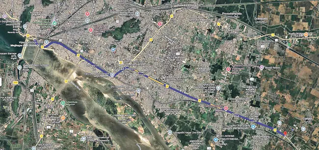 - Construction of elevated flyover will not require much land acquisition in Bejawada city limits. Land has to be collected for the approaches to be built to go to the bridge (entry) and to come out (exit) at various junctions. There is a debate going on whether to build a single bridge along its length or to divide it into two parts. In order to build a single bridge, as there are already two bridges at Benz circle in the middle, an elevated flyover has to be designed to take a turn towards the port from them.