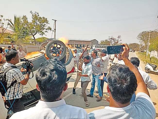Former sarpanch of Ramareddy mandal Posanipet and Congress party leader Geereddy Mahender Reddy bypassed the police presence and rushed in front of the MLA camp office in a car. The MLA got down in front of the gate and shouted slogans like Shabbir Ali Zindabad. This split the ranks of BJP. Immediately after trying to attack him, the police moved him from there. BJP activists vandalized Mahender Reddy's car and overturned it. For a while there was a scuffle between the police and activists. At the same time many people poured petrol on the car and set it on fire. In the background of these circumstances, there were rumors that BJP state president Ramachander Rao, party floor leader Maheshwar Reddy and some other MLAs and MLCs were coming. There is more tension in the town. Maheshwar Reddy and Malkajigiri MP Etala Rajender were arrested by the police in Hyderabad. Armor MLA Rakesh Reddy and MLC Anji Reddy who were coming to Kamareddy from Hyderabad were arrested in Medchal. Eleti and Etala strongly condemned the action of the police. Kamareddy SP Rajeshchandra said in a statement that Mahender Reddy and two BJP workers were arrested for pouring petrol on the fire.