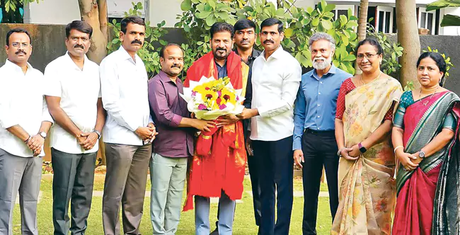 Today, Hyderabad: Udyoga, teacher, teacher The leaders of pensioners' associations thanked Chief Minister Revanth Reddy. In the wake of the state cabinet's approval of Rs 1.20 crore accident insurance coverage for employees and pensioners and Rs 1,056 crore capital fund for the health scheme for employees and pensioners, a large number of leaders of employees' and pensioners' unions thanked Chief Minister Revanth Reddy at his residence on Tuesday. They praised that the health and insurance schemes announced by the government for employees and pensioners will go down in history. The union leaders said that it is a real boon for employees and pensioners to get cashless treatment for 1,998 diseases. Among those who met the Chief Minister were Telangana Udyoga, Upadhyaya and Pensioners IKASA leaders Maram Jagadeeswar, Eluri Srinivasa Rao, P. Damodar Reddy (PRTU), Chava Ravi (UTF), K. Venkateswarlu (TNGO), Upender Reddy (TGO), G. Sadananda Goud (STU), Damodar Reddy, Umadevi (Pensioners Association), Vanga Ravinder Reddy, K. Gauthamkumar (Revenue), Giri Srinivas Reddy (Secretariat), Khader (Fourth Class Employees Association), T. Lakshman (Excise), Telangana Employees' ICASA Chairman V. Lachi Reddy, K. Ramakrishna (Deputy Collectors Association), S. Ramulu, Ramesh Paka, CH Srinivas (Telangana Tehsildars Association), Banala Ram Reddy, V. Bhiksam (Telangana Revenue Services Association), Dr. Nirmala, L. Dasharath (TGCPSEU), Garike Upender Rao (GPO), Sugandhini (HMWS&SW), Bhumesh, Sunil and others.